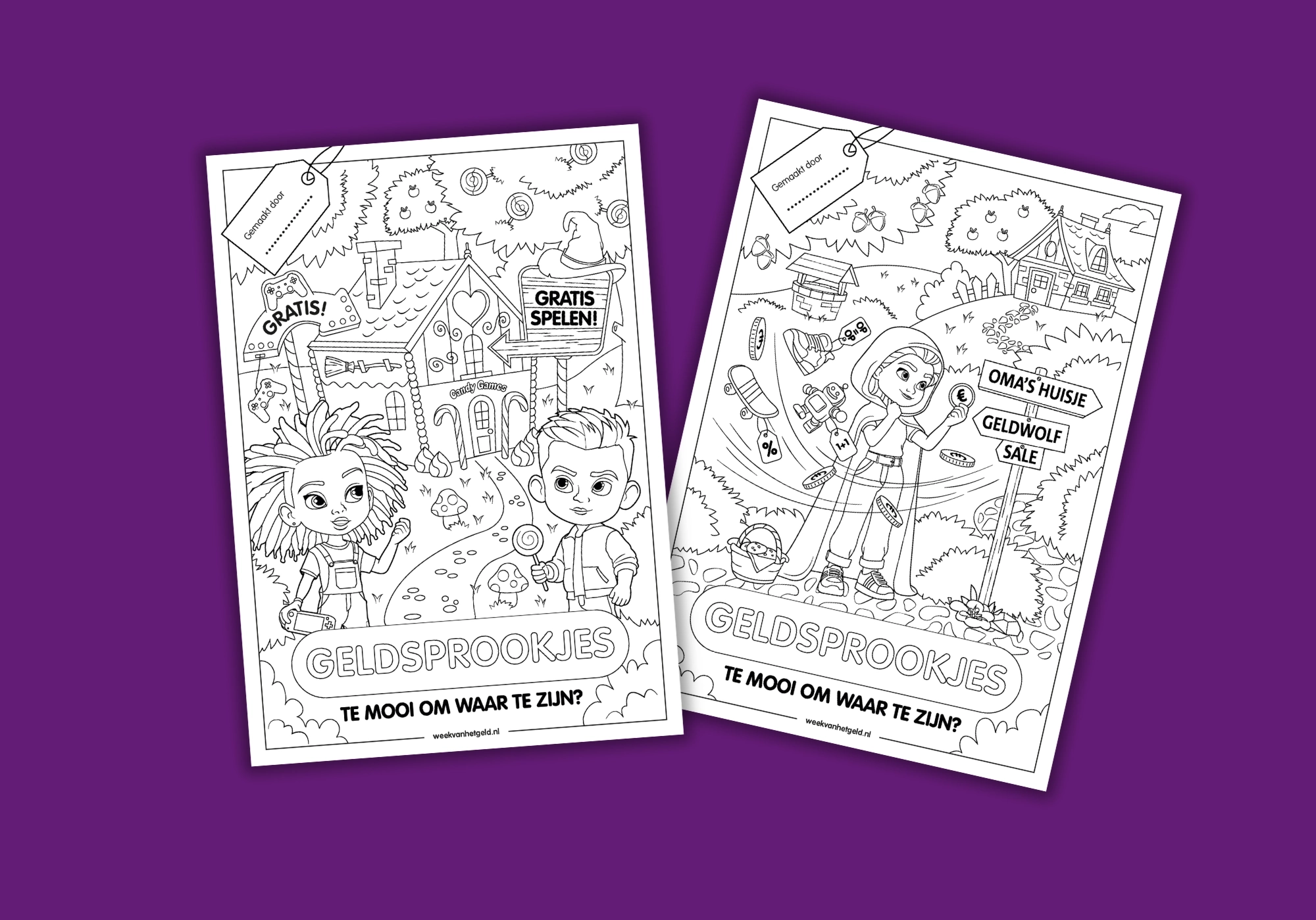 De kleurplaten vormen een leuke kleuropdracht voor jouw leerlingen, nadat je de interactieve les uit het themapakket hebt gegeven. Er zijn twee verschillende kleurplaten, ieder met een ander geldsprookje erop afgebeeld. Op de kleurplaten zijn verschillende gelditems afgebeeld die een mooi startpunt kunnen vormen voor een geldgesprek in de klas!